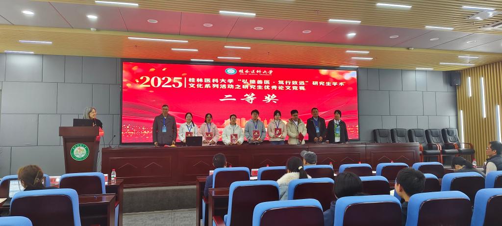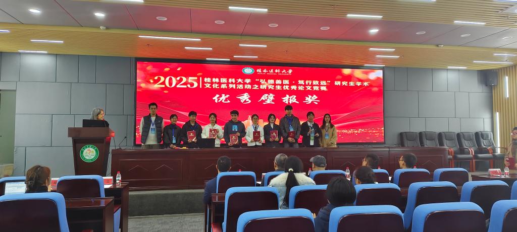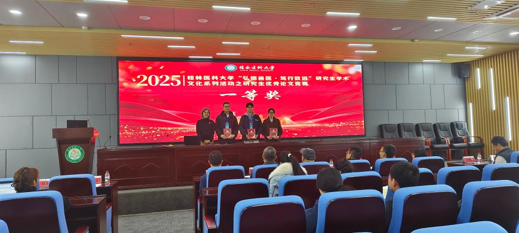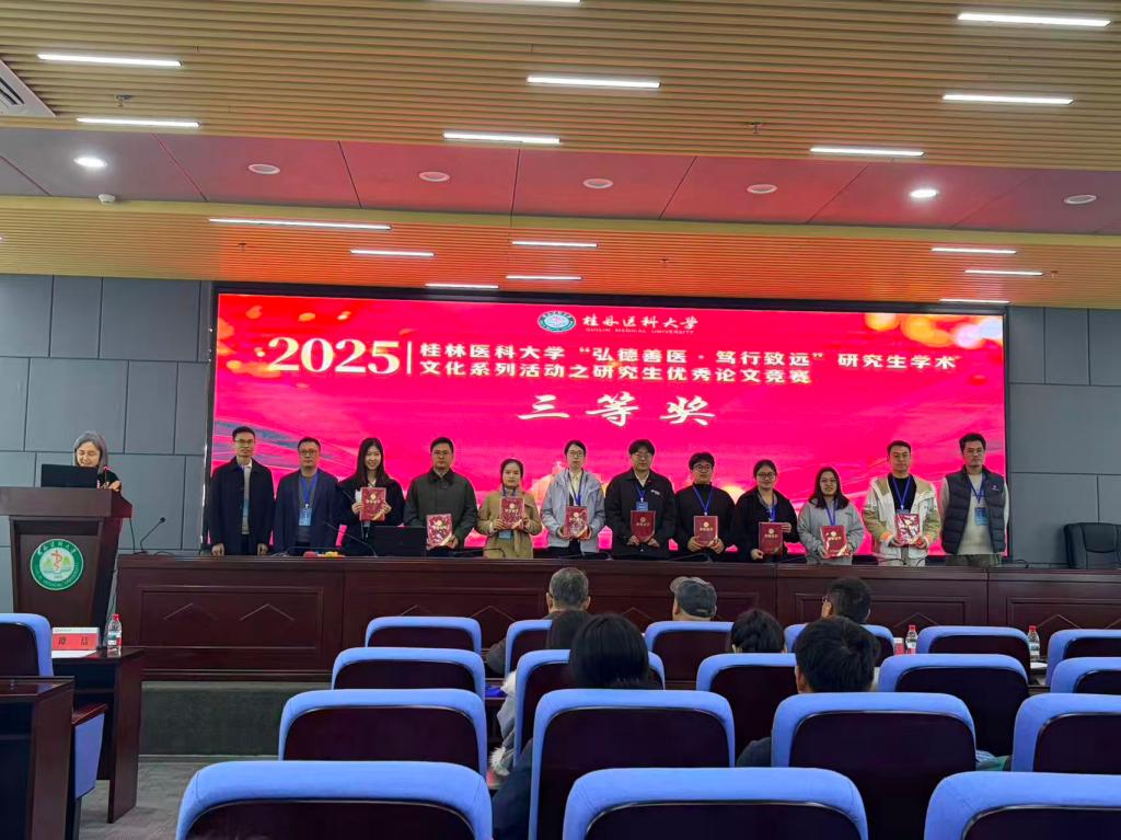 最后举行了颁奖仪式,为获奖同学颁发了荣誉证书及奖金,以资鼓励。 本次研究生优秀论文竞赛的成功举办,不仅为广西医学研究生搭建了一个高水平的学术交流与展示平台,有效检验和提升了研究生的科研创新能力和学术表达水平,更是桂林医科大学深化研究生教育改革、强化创新人才培养的重要举措。活动有力践行了“弘德善医、笃行致远”的育人理念,对进一步激发研究生科研热情、强化学风建设、促进学科交叉融合、全面提升研究生培养质量起到了积极的推动作用。学校将继续致力于营造勇于探索、鼓励创新的学术环境,为培养更多高素质医学人才贡献力量。