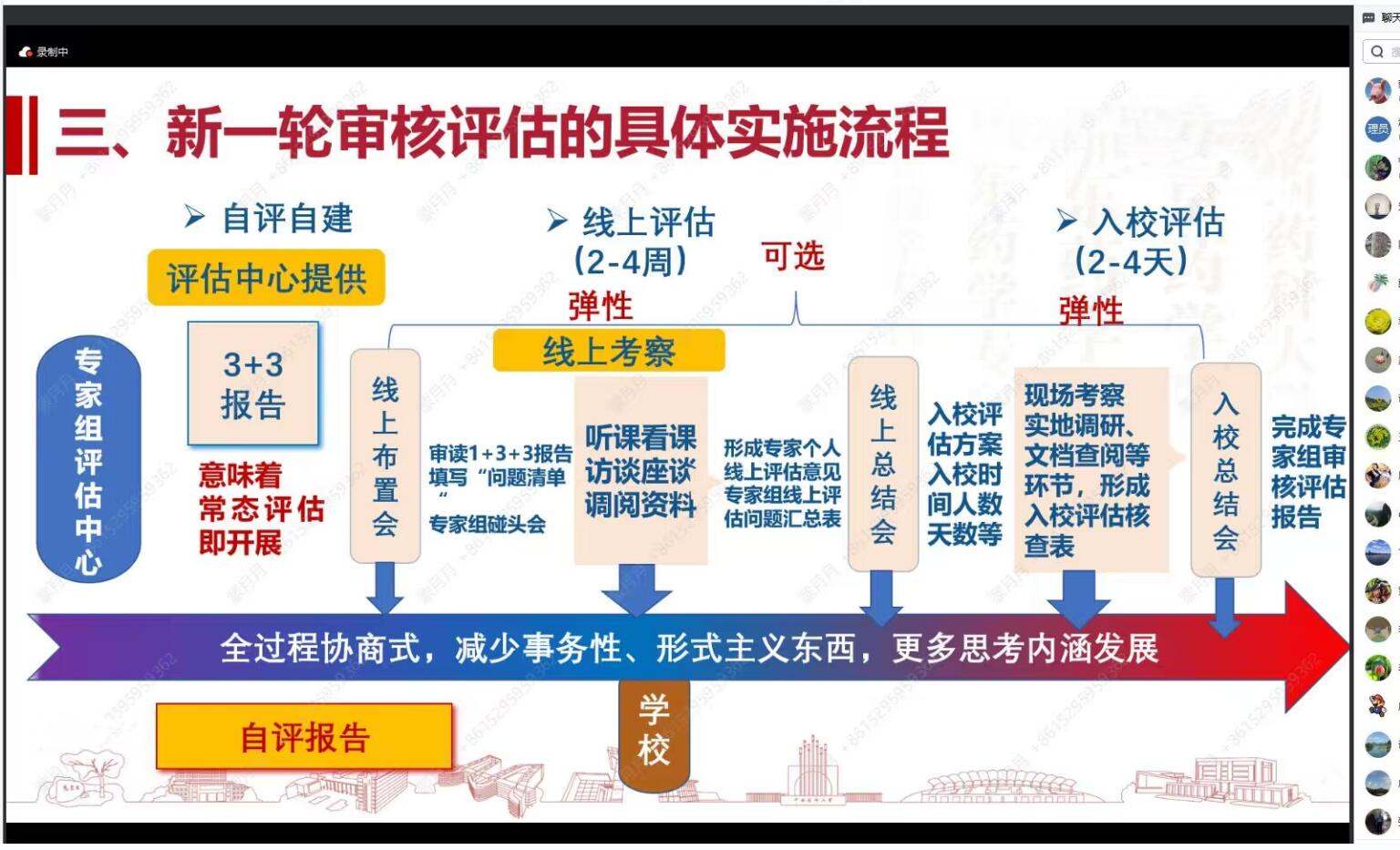 研讨会上,首先校外专家从新一轮审核评估、目前完成工作、具体实施流程、学院迎评准备、审核工作要求五个方面对审核评估全流程进行了详细解读,分享了审核评估学院文档清单材料等方面的注意事项。随后药学院评建工作小组成员基于前期编写自评报告过程中出现的相关问题与专家进行深入研讨,关于教学成效部分进行重点细化讨论。最后杨扬总结发言,表示会根据此次研讨有针对性地进行迎评准备,以评估要点指标推动教育教学改革。