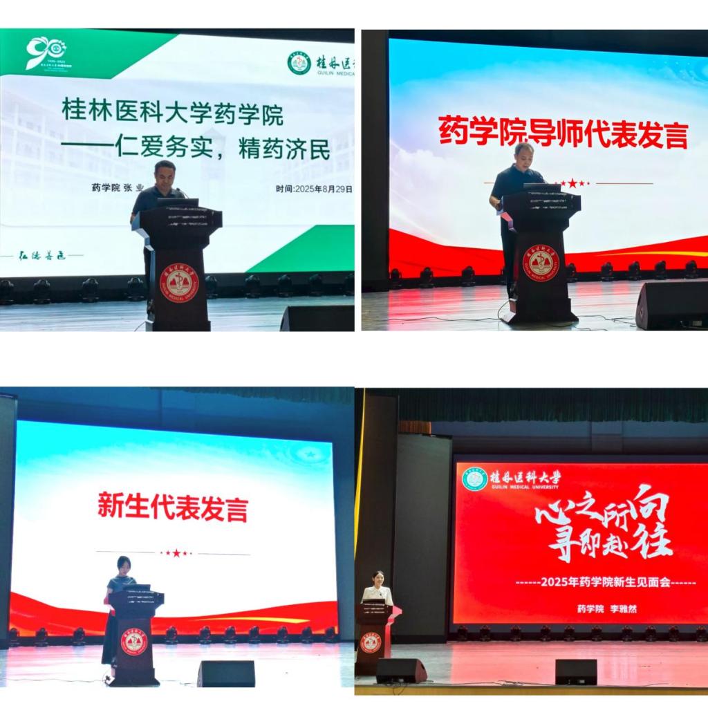 活动在全体起立、奏唱校歌的庄严仪式中拉开序幕。张业副院长向全体新生致以热烈欢迎,并详细介绍了学院的发展历程与整体概况,通过展示药苑成果、学院砥砺发展激励同学们扎实掌握专业知识、全面提升综合素养。导师代表李勇文老师以《在生命科学殿堂启航》为题,用敬畏、创新、共情三个关键词勉励新生们志存高远,积极投身学术科研,成为照亮生命奥秘的持灯者。2022级药学本科班李雅然同学作为优秀老生代表,从思想成长、专业学习与社会实践等多方面,分享了宝贵经验与心得体会。2025级新生代表曲馨楠同学在发言中表示,将恪守弘德善医校训,努力实现品德修养与专业能力的同步提升,立志成长为堪当民族复兴大任的医药领域专业人才。