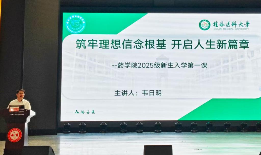 药学院党委书记韦日明为全体新生讲授了题为“筑牢理想信念根基,开启人生新篇章”的开学第一课。他围绕“筑牢理想信念、正确认识大学、快速适应大学、力学笃行读好大学”四个维度,寄语新生要以理想信念为帆,把准人生航向,以正确认知为舵,明晰发展目标,以适应调整为桨,顺利融入新环境,以力学笃行为力,驰而不息,奋斗前行,努力成长为“有理想、敢担当、能吃苦、肯奋斗”的新时代药苑人。