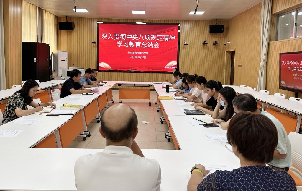9月18日上午,药学院在药学楼2108教室召开深入贯彻中央八项规定精神学习教育总结会,会议传达学习了习近平总书记重要指示精神、中央党的建设工作领导小组会议精神以及自治区党委常委会会议暨自治区党委党的建设工作领导小组会议精神,全面总结了学院在深入贯彻中央八项规定精神学习教育方面的开展情况,并对推进作风建设常态化长效化工作进行了研究部署。药学院党委书记韦日明主持会议并讲话,学院党政领导班子成员、“两委”委员、科级干部以及党支部书记参加会议。