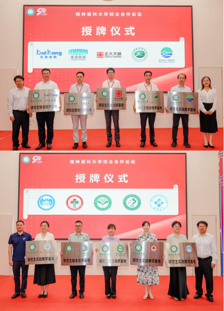 在研究生联合培养和实践教学基地授牌仪式环节,药学院党委书记韦日明、生物医药产业学院院长段小群、研究生院副院长周燕园共同为正大天晴药业集团股份有限公司、广东莱恩医药研究院有限公司、广州百康细胞生命科技有限公司等10家合作单位授牌。此次授牌标志着我校在医药人才实践培养、科研成果转化上迈出新步伐,我校将进一步打通校园教育与产业实践的衔接通道,为医药领域输送更多兼具理论素养与实践能力的专业人才,也为校企深化合作奠定坚实基础。