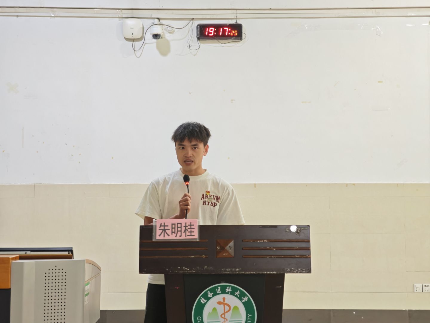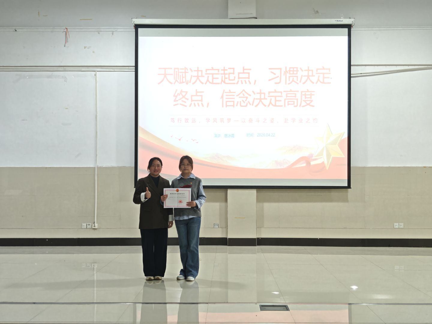 宣讲中,唐冰霞同学以“不止于习惯,更是信念”为主题,分享了课程学习规划、科研项目探索及平衡学业与实践的经验,展现了新时代青年学子坚定信念、勤学善思、勇于探索的治学态度;朱明桂同学以“携笔从戎,再启新程”为主题,讲述了军旅生涯中锤炼意志、坚守初心的故事,传递了军人的责任担当与青年的奋进力量;辅导员莫荣妹从有梦想、树榜样、勤奋斗、懂感恩等四个方面寄语同学们以志为帆、以榜样为灯、以勤学为桨、以感恩为舵,在勤学善思中锤炼本领,在笃行致远中成长成才。