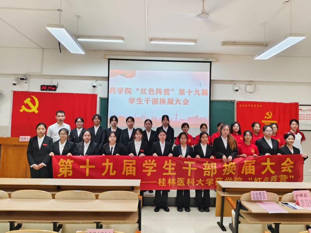 2025年6月24日19:00,药学院“红色阵营”在临桂校区楼南楼304教室召开了药学院“红色阵营”第十九次学生干部换届大会,药学院党委副书记李芳耀、各二级学院和班级代表及“红色阵营”全体成员出席了本次活动。